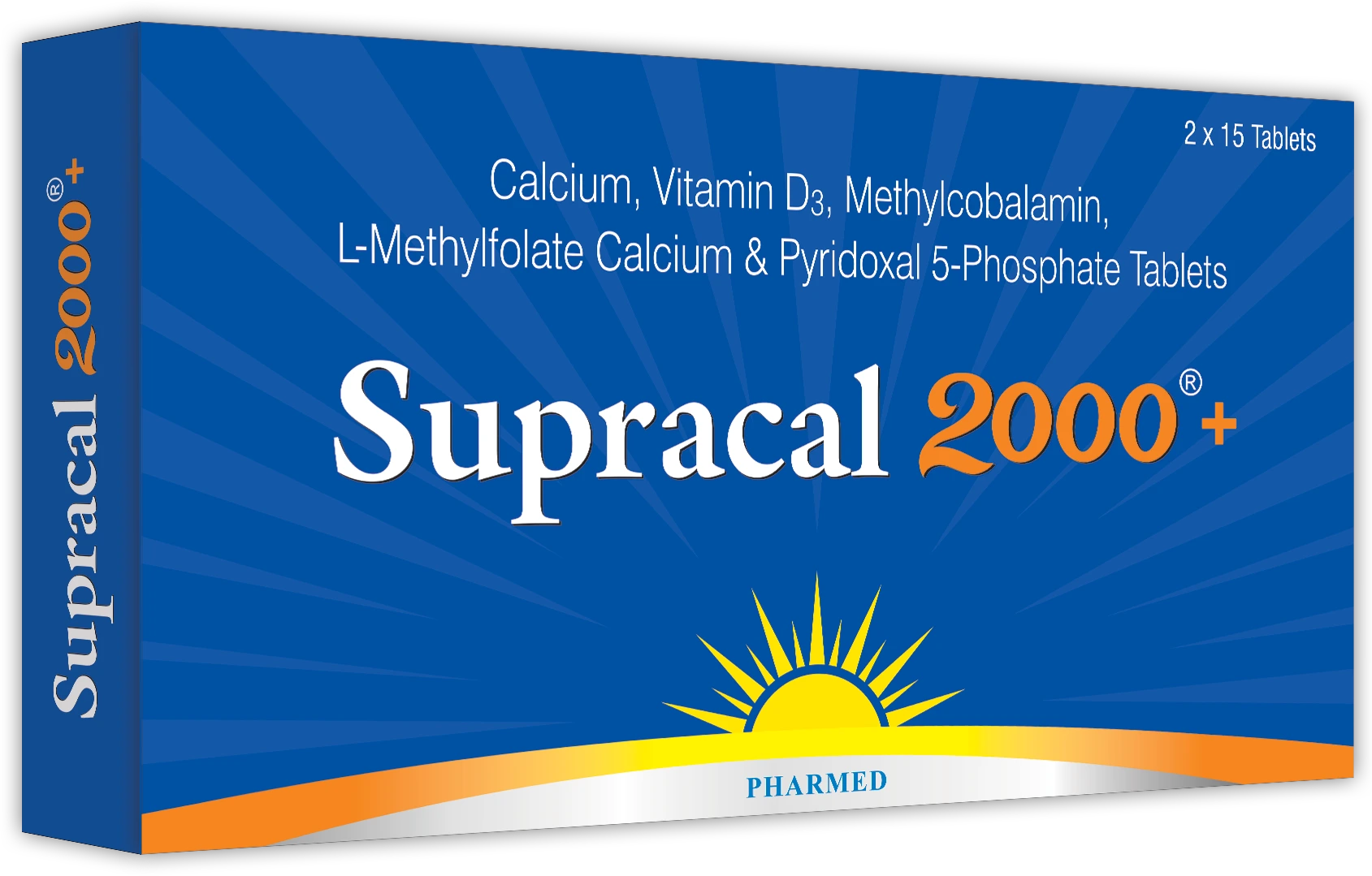 Supracal 2000 + offers 500 mg elemental Calcium with 2000 IU Vitamin D3 and a unique anti-homocysteine trio - Pyridoxal 5-Phosphate, Methylcobalamin, and L-Methylfolate, available at therapeutic dosage for better bone formation & mineralization and treatment of calcium & vitamins deficiency. In pregnancy, it helps meet the increasing calcium demand & folate needs. Supracal 2000 + supports bone strength, helps manage osteopenia, osteoporosis & fractures. In people with diabetes & high-risk of heart diseases, Supracal 2000 + may help control homocysteine levels, thus reducing associated risks.
